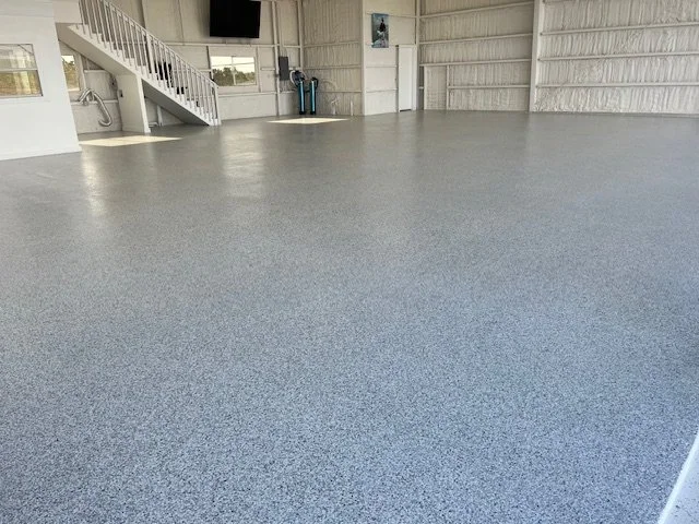 We apply a high‑performance, 100% solids epoxy base, then broadcast a dense layer of decorative polymer flake until the surface is fully covered—creating depth, texture, and lasting appeal that improves durability.Layered Topcoats for Maximum Performance